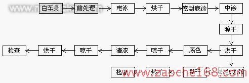 车身涂装历来是汽车涂装的代表。由于汽车车身结构复杂多变,装饰性要求高,所以其涂装工艺最复杂。经过多年的发展,公认的典型涂装工艺(如图2所示)可以很好地满足金属车身要求,而且如上所述在德国已经完全实现环保型涂装材料的应用,VOC排放降到了30g/m2以下[2]。