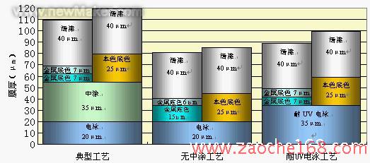 (3C1B概念)一体化涂装(Integrated coat)工艺是采用与面漆同色的功能层(15μm)替代中涂[2],功能层与面漆底色湿碰湿喷涂,在一条线(面漆线)上完成,生产过程简化,省去了中涂烘干线。在此基础上,又有无中涂工艺(Primerless Paint System)得到应用[2]。该工艺与3C1B工艺相比,进一步简化,将前述的功能层与面漆底色合一,彻底取消了中涂线,与耐UV电泳工艺比可以节省电泳漆40%。如图4所示,无中涂工艺涂层厚度最低,材料消耗最少。