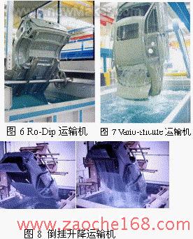 传统典型的运输机(推杆悬链、摆杆运输链、自行葫芦)对漆前表面处理和电泳都不同程度地存在难以解决的问题或不利影响(如处理槽体无效容积大、吊具污染、车身封闭腔排汽不良、带液量大、车身水平面易出现漆膜弊病等)。现在,可使被处理车身旋转的新型多功能穿梭机(Vario-Shuttle)、滚浸运输机 (Ro-Dip)和倒挂升降运输机诞生后,在解决了这些问题的同时兼具传统运输机的所有优点。多功能穿梭机可单独控制升降和翻转轨迹,可变处理时间,具有在一条生产线上实现多品种不同工艺的功能,完全符合自动化柔性涂装生产的要求,如图6、7、8所示。