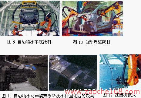 涂装车间人工劳动量最大、工作环境最差的环节是焊缝密封、车底喷涂、喷漆和内腔注蜡,这些环节很难实现完全自动化,即使喷漆和注蜡实现全自动化,系统也十分复杂,且对多品种混流生产方面有局限性。现在,随着材料、机械人和喷涂设备的技术进步,这些环节可以完全实现自动化,且对混流生产的适应性更强,见图9、10、11、12。由于新型的PVC喷涂系统喷形准确,没有飞溅,机械人动作重复精度提高,所以可取消遮蔽,密封及绝热涂料没有浪费,不再需要带供排风的车底喷涂室,环境空调等也可省去,工位也不像从前那样脏乱。