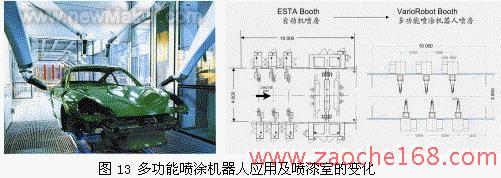 典型的侧喷加顶喷式中涂和面漆用自动涂装机(ESTA)对多品种生产,尤其是车形尺寸差别大的情况下,有局限性,顶喷机的喷涂功能局限性更大,且对涂装质量有不利影响。随着机器人技术的进步,多功能喷涂机器人(Vario-Robot)得到应用,显示出其功能方面的突出优点。不仅使标准的自动喷涂段喷杯数量由9支减少到6支,标准喷漆室宽度由4.6米减少到3.8米,可节能17%,而且,取消了顶喷机横梁,消除了典型自动喷涂机的种种弊端(如图13所示)。使喷涂质量进一步提高,更适应柔性生产,一次投资和运行成本进一步减少,新车型上线和设备维修更容易。
