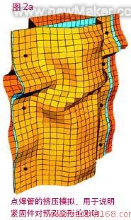 汽车装配通常包含成千上万个点焊。在碰撞过程中,点焊受损或遭破坏的方式会显著影响到汽车整体结构的耐撞性。我们为ABAQUS软件所开发的一种最有用的耐撞性模拟工具就是一种可用来模拟点焊的独立网格的紧固件。