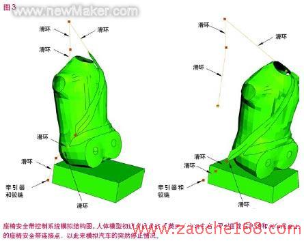 为了预测碰撞过程中车内乘客所面临的情况,工程分析学家对人体模型与汽车座位、座椅安全带控制系统以及辅助安全气囊在碰撞时所产生的相互影响作用进行了模拟。在ABAQUS软件中,座椅安全带控制系统是用一系列特殊的连接器元件来模拟的。这些元件是表示座椅安全带控制系统中各个连接点具体运动学原理的理想一维模型。有一种特殊的滑轮式连接器叫做滑环。