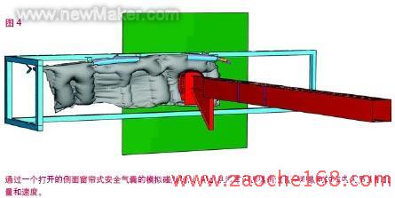 图4显示了一个打开后的侧面窗帘式安全气囊的模拟碰撞试验结果。在本次模拟中,安全气囊被分解成18个部分,以便于估算气体分布的不均匀程度以及气囊展开时所观察到的气压梯度。每个部分均用一个表面流体腔来模拟。安全气囊的表层用膜元来表示,并结合使用一种ABAQUS软件中特有的纤维物模型。碰撞器被模拟成一个总质量达7.2kg的刚体,并以4,500毫米/秒的初速度撞向正在打开的安全气囊。模拟结果与物理测试表现出惊人的相似。