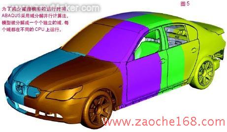 为了更好地支持碰撞建模以及其他复杂程度相当的模拟,ABAQUS软件已通过域分解法提升了其并行计算速度。其原理就是将模拟模型分成一个个单独的域,然后在不同的CPU上运行每个域。域与域的连接处设有一个信息交换元件,以确保计算顺序的一致性。该模型最理想的分解方式是使每个CPU所执行的任务量大致相等(参见图5)。