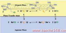PTC法是用水作溶剂 。其主要特点是:对湿气敏感的有机硅烷可在水系环境下进行生产却不产生结胶。另外,与其它所谓无水工艺生产的硅烷产品相比,PTC法生产的产品中的乙氧基部分有更少的水解和缩聚。因而产品纯度更高。另外,生产过程中也无需干燥硫化钠及使用其它有毒溶剂 - 甲苯/醇类等。所生成的盐类也易除去。通过工艺的相应调整,道康宁公司使用此技术生产硫链长度在 2~4 之间的硅烷。