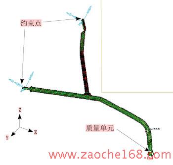 (1)建立有限元网格模型:分析前下视镜总成的结构,支架是影响前下视镜能否稳定工作的主要结构。因此,只要对支架结构做有限元分析,将前下视镜作为集中质量单元来处理。用四边形壳单元对支架结构进行网格剖分,单元尺寸5mm,得到的有限元模型,如图2所示。
