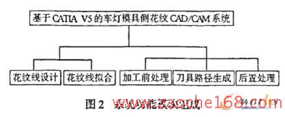 根据车灯罩模具侧花纹的特点,结合企业的软硬件现状,确定以CAD/CAM软件CATIA V5为开发平台,通过二次开发,实现车灯罩模具侧花纹CAD/CAM.在反复调研的基础上,提出了系统的功能模块组成,如图2所示。