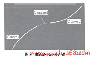 (2)取得相邻曲线在相邻端点位置处的切矢量,并判断切矢量夹角是否满足要求。曲线如果切向不连续,必须根据设计与加工要求,用一段光顺的曲线进行拟合。对于间隙过大的情况。原曲线不能用CATIA V5VBA提供的函数自动连接。这时做如下修补处理,在原先间隙过大的曲线间插入一段NURB曲线,并使其满足:以被连接线的端点为控制点,其端点切矢量与被连接线的切矢量一致,端点曲率等于被连接端点的曲率,控制点的权重取w=1,以抛弧线在连接处连接原曲线。这样,就可以实现2条曲线之间的光顺连接(见图3)。