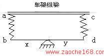 NJ6826TMF 车身与车架铆接按刚性连接处理;忽略充气轮胎变形,按全约束处理。减振装置的处理是,静态分析时,为避免钢板弹簧和前扭杆弹簧的变形干扰,弹簧与车架联接处按全约束处理;约束模态分析时,考虑车架下的弹簧系统对车身振动的影响,加入弹簧单元。该车前悬架采用扭杆弹簧;后悬架采用钢板弹簧,起导向和减振作用。该弹性元件(图4)刚度K =294000N/m;ANSYS 有限元模型的连接点a、b、c、d 沿Y 轴方向约束为零,其他5 个自由度均给于约束;段ab 和cd 为弹簧元Combin14,bd 段采用梁单元Beam4。弹簧刚度系数由扭杆弹簧刚度系数和钢板弹簧的刚度系数换算得到。
