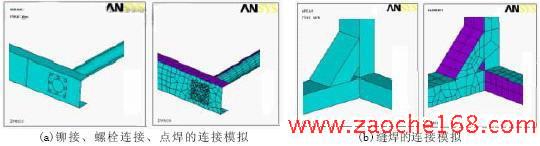 骨架结构件的连接方式为铆接、螺栓连接、焊接。基于ANSYS 壳元,用以模拟铆钉、螺栓、焊点传递力和力矩效果的连接处理是采用共面方式进行。例如,图5(a)所示的8个小圆面为实现结构件刚性连接的共用面,其网格分别与两结构件的网格形成连接;图5(b)所示的缝焊连接的模拟是,将两结构件相连的部分粘接(glue)在一起。对于梁元的连接模拟,ANSYS 的处理是,将梁元的节点融合(merge)在一起,模拟其刚性连接。