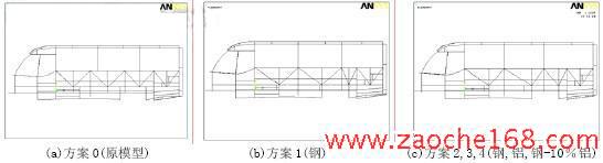 严重的能源消耗和地球环境污染,使汽车轻量化逐渐成为结构设计的重要指导原则。优化目的是,以骨架体积Volume 为目标函数,达到骨架质量降低,共4 种优化方案(图6);选取对车身性能影响较大的整车扭转刚度、车身一阶扭转模态频率、一阶弯曲模态频率为优化用的车身状态;优化设计变量(截面尺寸)是立柱长度(车门,侧窗,侧围)、侧围立柱宽、底骨架辅横梁长、底骨架辅横梁宽、顶盖横梁、车架前围斜支撑参数、底骨架主横梁厚度、侧围腰梁厚度等。这些变量对车身质量有重要影响,但对骨架刚度贡献不大。为提高优化效率和能够在全设计空间得到最优解,采用ANSYS零阶法;通过对目标函数添加罚函数将约束问题转换为非约束问题;该法能够有效地处理车身结构优化计算。ANSYS 提供分析—评估—修正的循环过程;即,分析初始设计,对分析结果按设计要求评估,修正设计;重复进行这一循环过程,直到满足为止。