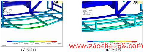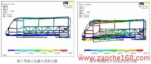 弯曲工况下,骨架的最大变形位于后排五人座的横梁中部,其值为5.92mm(图7)。弯扭工况下,左前轮悬空,变形最大部位产生在底架左前端,其值为5.778mm(图8)。