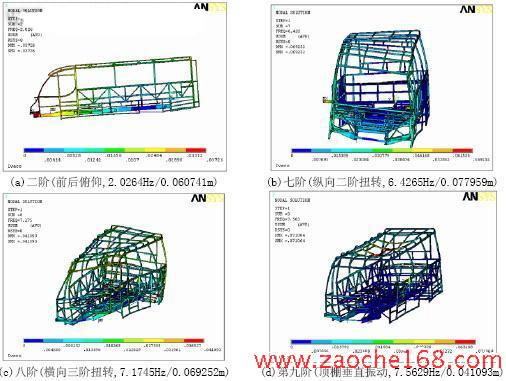 为用于谱分析,考虑汽车满载行驶时的运行工况,将乘员、座椅、行礼和发动机等附加质量按质量元mass21 分布;车身的前十阶模态计算举例如图9 所示。