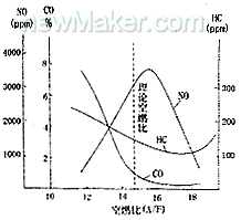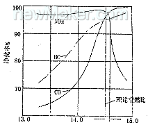 空燃比(A/F)对CO、HC和NOx的影响见图1。在理论空燃比附近,CO曲线有一个拐点,当A/F减少时,可燃混合气过浓,燃油无法充分燃烧,CO生成物便急剧增加;当A/F增大时,氧含量充足,燃油可以充分燃烧,使CO生成量减少,而且比较稳定。