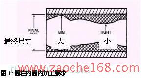 为达到图纸所要求的精度,采用珩磨加工是所有加工方法中去除余量最少的一种加工方法。在珩磨加工中,珩磨工具是以工件作为导向来切除工件多余的余量而达到工件所需的精度。珩磨时,珩磨工具先珩工件中需去余量最大的地方,然后逐渐珩至需去除余量最少的地方。