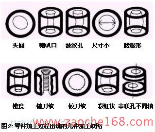 由于其余各种加工工艺方面存在不足,致使在加工过程中会出现一些加工缺陷。如:失圆、喇叭口、波纹孔、尺寸小、腰鼓形、锥度、镗刀纹、铰刀纹、彩虹状、孔偏及表面粗糙度等(见图2)。