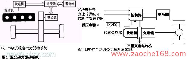混联式混合动力系统中的发动机和电动机,可以分别驱动汽车或同时驱动汽车,它们的工作状态是由计算机控制的。该系统适合各种行驶条件,不需外界充电,续驶里程与内燃机汽车相当,是最理想的混合电动方案,但结构复杂,成本高,控制复杂。