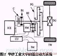 速度复合式结构是采用行星差速机构的混合动力系统,通过行星机构可以实现多个部件转速的复合,而各个部件间的转矩保持一定的比例关系。如图2所示的华沙工业大学的行星齿轮混合动力系统,内燃机和电动机通过行星齿轮变速器实现转速复合。丰田Prius行星齿轮混合动力系统的驱动系统则被公认为目前最成功的速度复合结构之一。