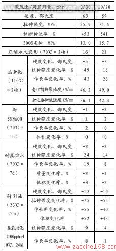 利用少量的蒙脱土和炭黑共同补强天然橡胶,可使材料的综合性能改善。表1反映了10份蒙脱土替代10份炭黑时对天然橡胶各项性能的影响,由表可见,材料的硬度减小,定伸强度、拉伸强度、断裂伸长率都明显提高,耐水、耐油、耐热氧老化、耐臭氧老化等性能较以前都明显提高。对于露天使用的轨道交通用橡胶减振器,蒙