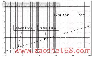 锥型弹簧和V型弹簧相比,其特点主要有:①采用圆柱衬套结构,可根据三向刚度要求进行槽孔的不同设计;②根据橡胶弹簧的压、剪锥体理论,采用等应力层设计方法及特选的弹性橡胶,更有利于减小产品的蠕变;③能提供最大的牵引力,平衡车轮荷重,控制纵、横摆动。因此目前国内外新设计的城轨地铁转向架上,大都采用锥型弹簧取代V型弹簧,其关键技术也是抗蠕变能力,即使用期中蠕变不能超过产品工作载荷下垂向位移的20%。时代新材公司生产的锥型弹簧经德国Contitech公司检测和计算,10年的蠕变值不到5mm,仅为工作载荷下垂向位移的12%(见图4)