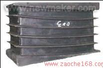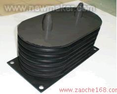 由于橡胶堆产品其横向变位能力不足,难以承受更大的横向变位,因此,国外采用了一种称为摇枕的减振橡胶制品,用于二系悬挂,通常四个为一组,反对称安装在机车车辆转向架上。与橡胶堆相比,其具有以下特点:①铁件隔板为微圆弧形,厚度约为1.5毫米,且端板与隔板间填充橡胶,重量较橡胶堆更轻。②垂向预压下,能产生一定的横向定位,这有利于摇枕获得更优的变位能力。③利用钟摆效应,提供滚动稳定性,有利于机车车辆的曲线通过。④能有效地隔离垂向及横向冲击和震动。此产品经时代新材开发后也已在国内推广使用。