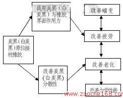 炭黑表面含有羧基、羟基等多种官能团,白炭黑的表面也有大量的羟基官能团,可以利用这些高活性的基团来改善炭黑与白炭黑对橡胶的作用。