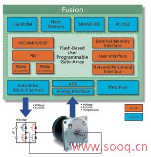 ![]() 图1:传统运动控制实现方法需要多个分立元件。这种闭环运动控制系统使用一个网络接口、微控制器、模拟器件、霍耳 (hall) 传感器接口和控制逻辑。 举例说,当今汽车制造业广泛使用由步进电机驱动的机械手。机械手系统使得分布式控制更为复杂,而不同的机械手要同时在几个车辆上安装不同的零件。系统设计人员主要的挑战之一是要通过局域网络实现各个机械手和其他自动化设备的同步。更复杂的是,远程管理功能(如监视、数据共享和远程配置) 对复杂的中央控制拓扑结构往往非常关键,也就是说,必需有一个有效的分布控制机制。 随着半导体工艺和集成度的提高,现场可编程门阵列(FPGA) 已成为许多电子运动控制应用的重要替代平台。FPGA的发展迅猛,在许多应用领域中替代了特定用途集成电路(ASIC)。非易失性FPGA是具成本效益的ASIC替代方案,不存在采用ASIC时涉及开发成本高和开发时间长的问题。而且,利用FPGA替代固定的逻辑,设计人员无论在设计阶段还是在应用现场,都可以高效、可靠地实现产品升级及定制功能。 以Flash 为基础的混合信号FPGA (如Actel Fusion PSC) 能在单芯片上实现前所未有的集成度。因此,这类器件可替代多个分立元件,能使成本和占用板卡空间减少最少50%,同时又能维持系统的可靠性(图2)。而且,混合信号器件上集成的Flash 内存可以让设计人员存储设计文档,不象那些以SRAM为基础的FPGA需要另外配置PROM。此外,与其他可重编程FPGA解决方案一样,可配置和灵活的混合信号FPGA器件可以在开发过程中甚至应用之后,轻易进行设计变更。 众所周知,FPGA能通过并行处理加快数学运算,使它成为实现电机控制逻辑的理想选择。FPGA能执行更严格的控制环,因此提供更佳的控制和更少的波动和噪声。设计人员还能在集成了Flash 内存的混合信号FPGA中集成软处理器核,从片上存储器直接运行,从而紧密地配合控制逻辑和中断驱动程序的需要。由于设计中的逻辑门数量和类型及控制逻辑的功能因应用而有所不同,即基于性能要求而定;因此,可编程逻辑往往最适合于实现各种用户接口和数字控制逻辑,包括网络和外设接口、脉冲宽度调制(PWM),以及正交编码器接口和传感器输入;这对当今的运动控制系统都非常重要。 网络和外设接口 在运动控制系统中,网络和外设接口可让用户发出指令对逻辑电路进行初始化、配置和控制,并且远程管理控制系统。根据功能和拓扑结构的不同,每个运动控制系统的网络和外设接口都可能会采取独特的实现方式,但有一点共同的是,都会利用接口来提高系统的可访问性。 目前已经有各种各样的工业标准接口,如用于本地访问的通用串行总线(USB)、基于RS232的串口和控制器局域网(CAN) 接口,以及基于TCP/IP网络协议的10/100以太网。在苛刻的环境下,如汽车制造车间,可能还需要无线网络接口。这种接口可在制造车间内实现系统同步、数据共享、状态监视和故障报警。此外,基于TCP/IP的网络接口则用于延长由任何距离远程访问中央制造控制设施的能力。