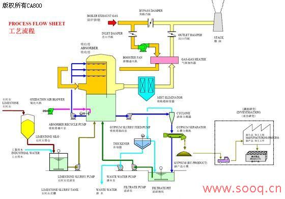 工艺主要包含:烟气系统、吸收系统、石灰石浆液制备及供给系统、石膏旋流系统、石膏脱水系统、排空系统、废水处理系统等。由以下主要部件组成:吸收塔、气气换热器、增压风机及其它设备和辅助系统、石灰石浆液制备和石膏脱水机等。