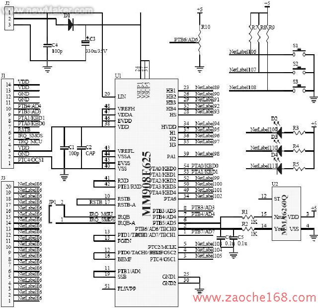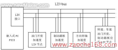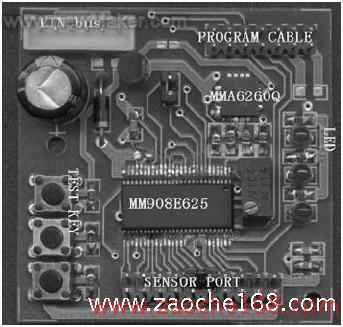 加速度传感器Low-G分别被安装在方向盘的转向轴、油门踏板和刹车踏板上,由MCU/DSP嵌入式微处理器MM908E625对传感器的信号进行处理,并组成LIN总线网络。