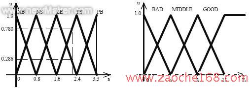 设油门开度模糊控制的输入量分别为油门开度s,发动机转速n、车速v 和油门开度加速度a。将加速度划分成“负大NB”、“负小NS”、“零ZE”、“正小PS”、“正大PB”五个等级(即五个模糊子集)。控制器的输出为对车辆的驾驶状态的优劣(以H 表示),分为“好GOOD”、“中MIDDLE”、“差BAD”三个等级。为了实现模糊化,确定油门开度加速度a 模糊子集的隶属度函数如下图(4)所示。为了按照一定的语言规则进行模糊推理,确定输出量即反映驾驶状态的优劣的隶属度函数如下图(5)所示。