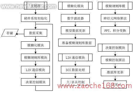 PC 机程序用C 语言编写,完成数据库的建立和维护、对LIN-BUS 网络的管理、模糊控制器算法和规则的运算、交互界面的输入输出控制。软件框图如图(6)所示。