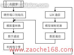 测量模块是以MM908E625 单片机为核心的数据采集器, 程序用CodeWarrior3.1 CW-HC08 3.0 设计,测量模块软件框图如图(7)所示。
