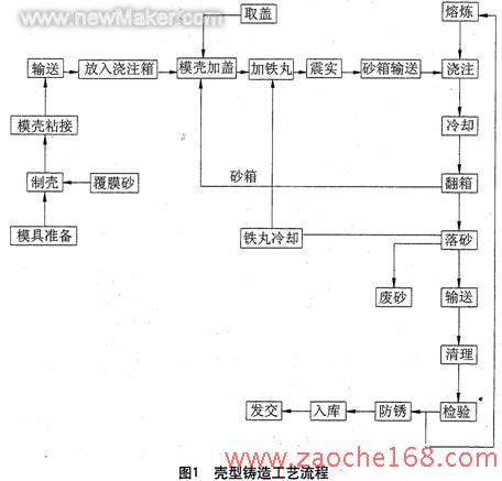 壳型铸造是采用覆膜砂制壳,两壳粘接一起形成铸型,采用中频感应电炉熔化铁水并浇注成铸件的工艺方法,其主要工艺流程见图1。