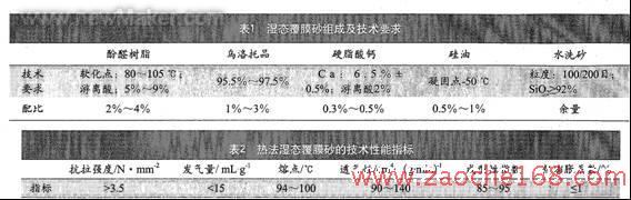 制壳用覆膜砂。湿态覆膜砂组成及技术要求见表1。热法湿态覆膜砂的技术性能指标见表2。