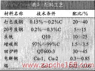 针对曲轴加工性能等问题,对曲轴炉料进行大量的试验研究和改进,从提高曲轴质量和降低生产成本两方面考虑,目前曲轴的炉料还在不断地优化,但基本上是以废钢加增碳剂为主体的炉料,具体配料工艺见表3。