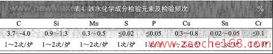 要铸造优质的曲轴,必须保证铁水质量,特别是铁水的化学成分,其次是铁水的出炉温度(球化处理时铁水温度)和浇注温度。铁水化学成分检验元素及检验频次见表4。