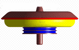 该D580空气弹簧主要由4部分组成,分别为上盖板、支撑橡胶堆、本体橡胶胶囊和附加空气室。图1为其CAD模型,第一幅图为空气弹簧的本体总装图,第二幅为沿轴向剖开后的示意图。空气弹簧的本体通过管道连接到附加空气室。