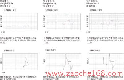 带有惯性传感测试模块的一体化安全气囊具有与底盘控制单元相连的专用CAN接口,这使得系统数据源头对于EHCU来说显而易见。接下来的图标显示了三类典型操纵情况下,被测试模块的表现,该模块能提供用于ESC系统的主要信号。