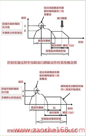 车辆处于斜坡起动时,当挡位位于前进挡,驾驶者右脚离开刹车踏板,车轮产生后退趋势时(上坡时驱动力不足),HAC系统会自动地保持刹车油压2~3s,即此系统自动施加制动力于车轮,使车辆停止,而当车轮又向前运动时制动力会自动释放,防止溜车现象发生。但此系统不能像停车制动那样长时间驻车,也就是说保持刹车油压2~3s之后,如果驾驶员还没有踩油门踏板的动作,车辆还会溜车。刹车油压时间控制是通过ECU的延时向排液电磁阀发出泄压信号。