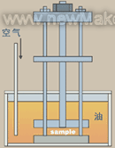 从拉伸大块中冲出垫圈样品,外径为19毫米,内径为15毫米,厚度约为2毫米。每个夹具使用体积为200毫升的测试油。在测试油通风和不通风时测试所有样品。包含在Elastocon设备内的通风组件被用于测试,样品暴露于通风机油。图1显示Elastocon设备包含单根塑料管,将空气导入样品容器内。空气流动速度为7毫升/分。样品被压缩,厚度比室温小25%,在150℃烤炉中老化。在整个测试期间,在老化温度测量反作用力。