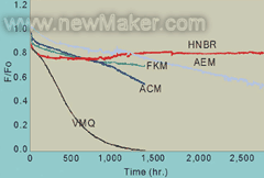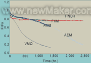 表1显示在室温测量时所有五种化合物的应力应变特征。所有样品的硬度约为65±5pts,为用于发动机密封应用,例如密封或衬垫的典型化合物的硬度范围。在所有样品中,HNBR的拉伸强度明显最高,硅氧烷最低。所有五种化合物的延伸率数值从接近200到最高300%。FKM和硅氧烷在低延伸率时应力更高,而AEM和HNBR在延伸率超过100%时应力更高。HNBR的撕裂强度也比其它化合物高。