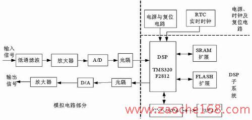 如图2所示,智能控制器主要由模拟电路部分(包括数字信号采集电路和输出信号处理电路)、DSP子系统(包括DSP芯片及外围电路)、电源、时钟及复位电路等构成。下面将介绍几个主要电路的设计。