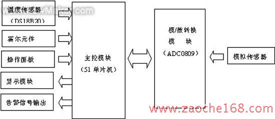 本系统功能由硬件和软件两大部份协调完成,硬件部分主要完成各种传感器信号的采集、转换,各种信息的显示等;软件主要完成信号的处理及控制功能等。