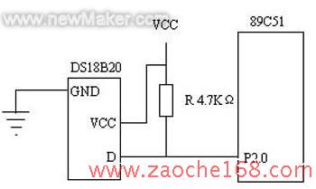 DS18B20是Dallas公司推出的单线数字式测温芯片,它能在现场采集温度数据,并将温度数据直接转换成数字量输出。DS18B20与AT89C51的接口电路图如图2所示,其中DS18B20工作在外部电源供电方式,单片机89C51采用P2.0和DS18B20通信。