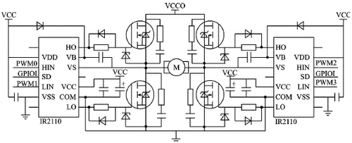电动机控制电路的设计在电动助力转向系统的设计中是比较关键的部分。随着计算机进入控制领域,以及新型的电力电子功率元器件的不断出现,直流电动机的结构和控制方式都发生了很大的变化,采用全控型的开关功率元件进行脉宽调制(Pulse Width Modulation,PWM)的控制方式已成为绝对主流。在本系统中,电机的控制就是采用的PWM脉宽调制控制方式。全桥双极性驱动电路如图3所示。