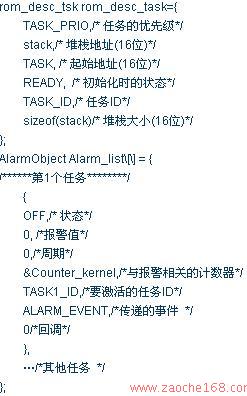 PICOS18通过taskdesc.c定义任务的各个参数,并且是用OSEK/VDX规范中的OIL(OSEK/VDX的实现语言,类似于一个C结构定义)编写的[5].由于PICOS18没有提供GUI用于任务的配置,因此只能逐句编写。任务的参数定义结构如下: