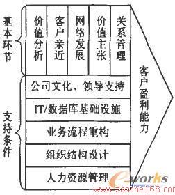 CRM价值链由基本环节和支持条件构成,如图4所示。基本环节包括5个部分,它们是经销商识别客户终身价值,通过为客户创造价值实现企业自身价值的基本过程。支持条件是新价值链形成的基础和和实施的保障。