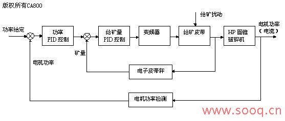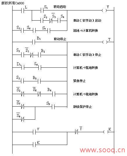 | 摘 要:本文设计了一套基于PLC的监控系统,应用于金矿碎矿生产线控制系统改造。系统由性价比高的PLC,工控机和组态软件构成。通过PLC编程,实现了对生产设备的全面自动控制、联锁保护、运行状态监测等功能;运用组态软件,设计了具有良好的人/过程接口能力的监控画面,实现了过程信息的集中显示和处理。实际运行表明,该系统功能设计合理,运行可靠,显著提高了生产效率。 关键词:金矿;设备改造;监控系统;PLC;组态软件 1 引言 近年我国不少矿山企业为了实现高效、节能、环保等各方面日益增长的要求,积极进行设备的更新改造。某金矿在碎矿生产环节引进了Nordberg HP圆锥破碎机,以进一步优化生产指标和提高效率。但是该矿原先采用的碎矿生产控制系统是以人工操作为主的常规继电器控制方式,自动化水平低,对生产过程的各种信息缺乏有效的监控手段,不能及时响应各种情况,加上电气设备老化,故障率高,维护频繁,严重制约了新装备生产效率的发挥。因此,需要对原有控制系统一并进行改造。可编程控制器(PLC)作为一种先进的工业自动控制装置,具有功能强大、编程灵活、调试使用方便,且性价比高等众多优点,特别是它适应各种工业环境的能力和高可靠性,使它得到广泛的应用。因此在本改造项目中,决定采用PLC来改造并扩展原有控制系统的功能,并且运用组态软件,设计生动直观、功能丰富的监控流程画面,实现生产过程信息的集中显示和处理。 2 工艺与控制要求 某金矿碎矿工艺为三段一闭路流程:原矿首先从原矿仓通过重型板式给矿机送入鄂式破碎机进行粗碎,然后由1# 皮带给入标准圆锥破碎机进行中碎,再经2# 皮带给入振动筛,筛上产品经3# 皮带返回短头圆锥破碎机进行细碎,细碎产品汇入2# 皮带,与振动筛构成闭路;筛下合格产品由4# 皮带送至粉矿仓。在控制上主要是对破碎、筛分及输送设备的起/停控制、联锁控制及保护,以及对设备运行状态和关键参数的监测记录,包括:①重板给矿机、鄂式破碎机、2台圆锥破碎机、振动筛及4台皮带设备的电机起停控制、电机过载(热继电器状态)的监测及自动联锁;②2个圆锥破碎机稀油站、自动除铁装置、及3台除尘风机起停控制和工作状态监测;③粉矿仓超声波料位计的信号监测;④控制室与现场各车间联络的声光警示信号。 本次改造还增加了以下项目:⑤鄂式破碎机、2台圆锥破碎机和轴瓦温度监测;⑥2台圆锥破碎机的电机工作负荷电流监测,以实现恒定负荷控制;⑦1#和3#皮带安装电子皮带秤和变频器,以实现给矿量控制;⑧控制室原有集中操作台和设备就地开关保留,和PLC控制系统通过转换开关进行工作方式切换。 3 系统硬件配置 根据前述控制要求,在充分考虑了系统的可靠性、稳定性、通用性基础上,确定本监控系统采用集中式的控制结构,分为3级:过程监控站、PLC控制器和现场电气驱动和信号检测。PLC控制器选用西门子SIMATIC S7-300,该型PLC技术成熟可靠,应用广泛,具有功能强、速度快、模块化等特点,具体配置为:CPU314,带有MPI接口,配64k EPROM存储卡做程序掉电保护;16通道DI模块SM321,5个;16通道DO模块SM322,3个;8通道AI模块SM331,2个;4通道AO模块SM332,1个;考虑系统的总点数和今后扩展的需要,配置了1个扩展机架,主机架和扩展机架之间通过通信模块IM360和IM361通信。监控站采用研华工控机,运行澳大利亚的CitectSCADA过程监控组态软件。S7-300和监控站计算机的通信采用MPI接口,在上位机中安装CP5613通讯卡,通过MPI电缆进行连接。 4 PLC控制功能设计 PLC程序是实现整个系统功能的核心,设计内容较多,下面主要介绍生产设备的起停联锁逻辑控制和破碎机恒定负荷控制。 4.1设备起停联锁逻辑控制 碎矿设备控制具有以下特点:逆流程起动,即先起动4 # 皮带机,最后起动重板给矿机;顺流程停机,即先停重板给矿机,最后停4 # 皮带机,并根据皮带速度、长度加以延时间隔,以免发生堆料的现象。为保护设备及人员安全,还需要满足较为复杂的联锁关系:①当皮带机、振动筛、圆锥破碎机、颚式破碎机中任一设备发生非正常停车或严重故障时,立即停止上游设备的运行,下游设备保持原工作状态不变;当重板给矿机、除尘器和除铁装置等辅助设备发生故障跳闸时,只向主控室发出故障信号,而不中断系统的运行;②重要设备如圆锥破碎机等受到监测的轴瓦温度、电机负荷电流和稀油站工作参数信号也参与联锁,在信号超限时自动停机,以防止设备受损;③根据皮带机系统的故障性质,进行紧急停机、顺序停机或发出声光报警;④在监控站画面上及操作台都设有“紧急停止”按钮,当出现重大险情和故障时,操作“紧急停止”按钮能立即停止全线设备。 系统从安全可靠、灵活高效的原则出发,设置3种控制方式:①计算机控制方式,正常生产时使用,操作员在监控站画面实现设备联动或单动;②操作台控制,是保留系统原来的操作方式,作为监控站失效时的备用;③就地控制,可以用机旁电气开关实现设备的起/停,满足设备检修、试车、紧急事故处理的需要;在PLC柜上设有转换开关和转换预置按钮,可在3种控制方式间进行任意转换。 通过对上述控制功能和PLC各个输入输出信号的仔细分析,确定出单台设备的控制逻辑,利用西门子STEP7编程软件编写出梯形图(LAD)程序,见图1。其中,K为控制设备起/停的PLC输出信号,Y为启动逻辑信号,T为停止逻辑信号,由以