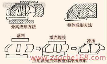 汽车车身零件传统工艺中有两种成形方法:分离成形和整体成形。分离成形方法是将大型零件分成小型单个件分别成形,然后焊接成部件,其优点是可以根据各部位的要求选择不同材质、不同厚度的材料;缺点是需要更多的工装模具和设备的投入,制造成本较高,同时焊接总成的配合精度和整车质量也有所下降。整体成形法是用整体板料直接成形大型零件。主要的优点是工装模具和设备的投入大大减少,制造成本相对较低,产品质量得到了提高;缺点是必须对零件所有部位采用相同材质和相同厚度的材料,难以很好的实现结构优化的需要。